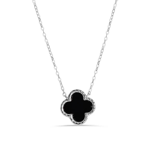 Rhodium Plated 925 Sterling Silver Black Enamel Four Leaf Clover Adjustable Necklace