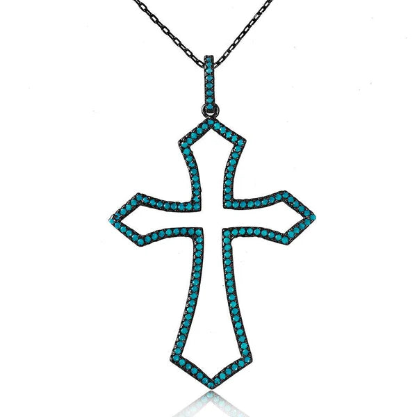 Silver 925 Black Rhodium Open Cross Necklace with Synthetic Turquoise Stone
