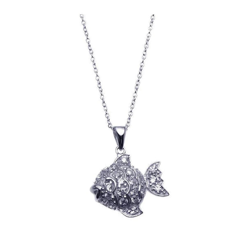 Silver 925 Rhodium Plated Clear CZ Fish Pendant Necklace