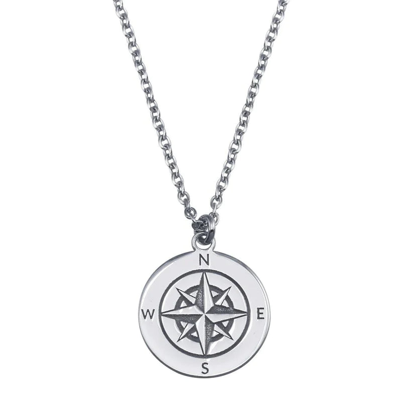 Silver 925 Rhodium Plated Compass Engraved DiscPendant Necklace