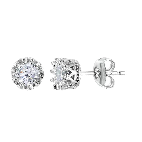 Silver 925 Rhodium Plated Crown Set Studs with Clear CZ Stone