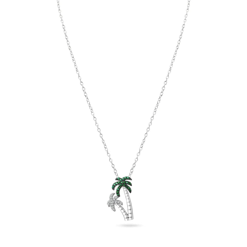 Silver 925 Rhodium Plated Green and Clear Two Palm Tree Pendant Necklace