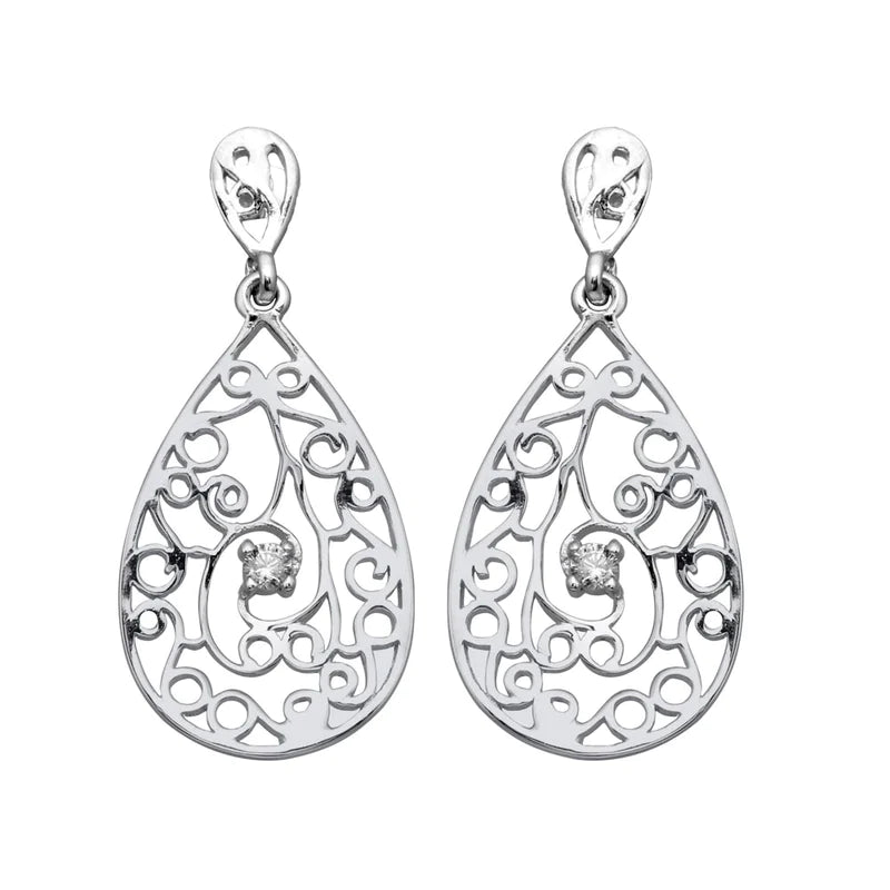 Silver 925 Rhodium Plated Teardrop Filigree Dangling Earrings