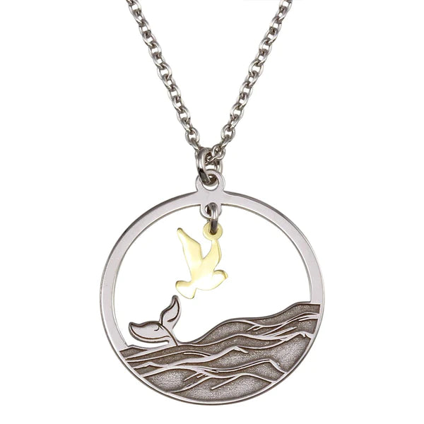 Sterling Silver 925 Two Toned Whale Tail and Bird Pendant Necklace